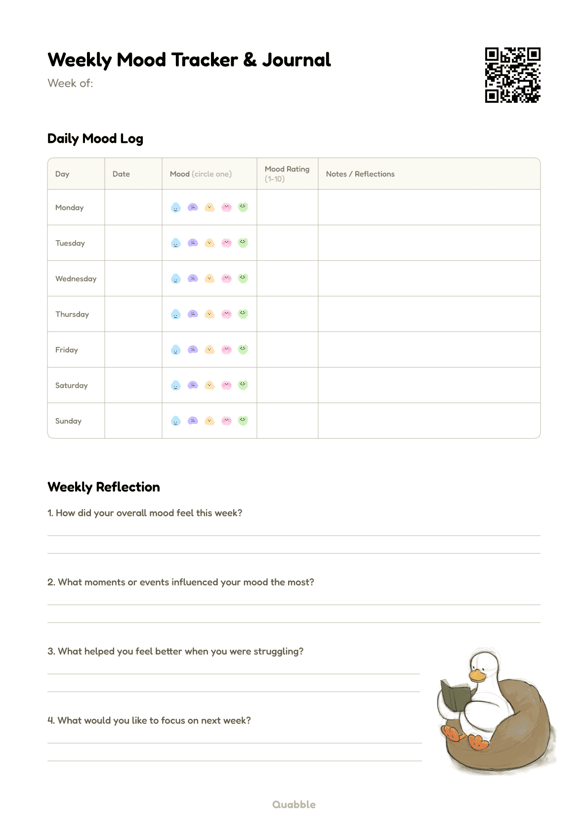While printable activities like this mood tracker above are great for clients who prefer working with printables or PDFs, there are other ways to track mood that can be easier to implement into a busy daily schedule. For this reason, we created Quabble, where you can find over 20 activities to support your clients’ mental health, including this mood tracker in a digital format. A digital mood tracker helps clients stay consistent with the help of reminders, have an all time access to the tracker from their phones, and explore additional ways to apply insights from therapy sessions. Try Quabble for free and explore how digital activities like this one can complement and support your clients’ mental health work.